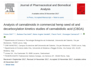 Analysis of cannabinoids in commercial hemp seed oil and decarboxylation kinetics studies of cannabidiolic acid (CBDA)