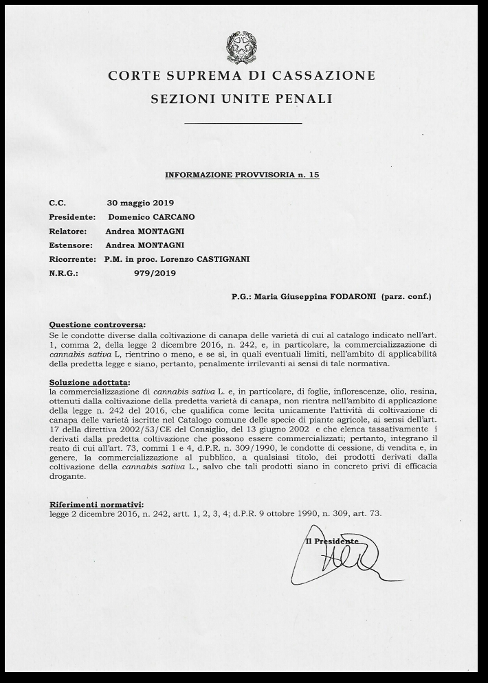 Malgrado le dichiarazioni di moltissime testate giornalistiche, la soluzione delle sezioni unite penali della Corte di Cassazione non determina a nostro parere la chiusura generalizzata dei negozi che offrono prodotti a base di canapa. Il testo della soluzione dice infatti chiaramente che la cessione, vendita e in genere la commercializzazione al pubblico di questi prodotti è reato “salvo che tali prodotti siano in concreto privi di efficacia drogante”. Per tanto la Cassazione ha ritenuto che condotte di cessione di derivati di canapa industriale privi di efficacia drogante NON rientra nel reato di cui all’art. 73 del T.U. Stupefacenti.