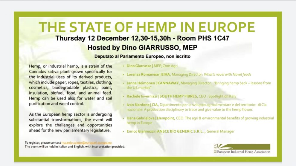 12 dicembre 2019 al Parlamento europeo, “The state of hemp in Europe” – L’iniziativa promossa dall’Europarlamentare Giarrusso avrà inizio alle 12:30, nella sala PHS 1C47.