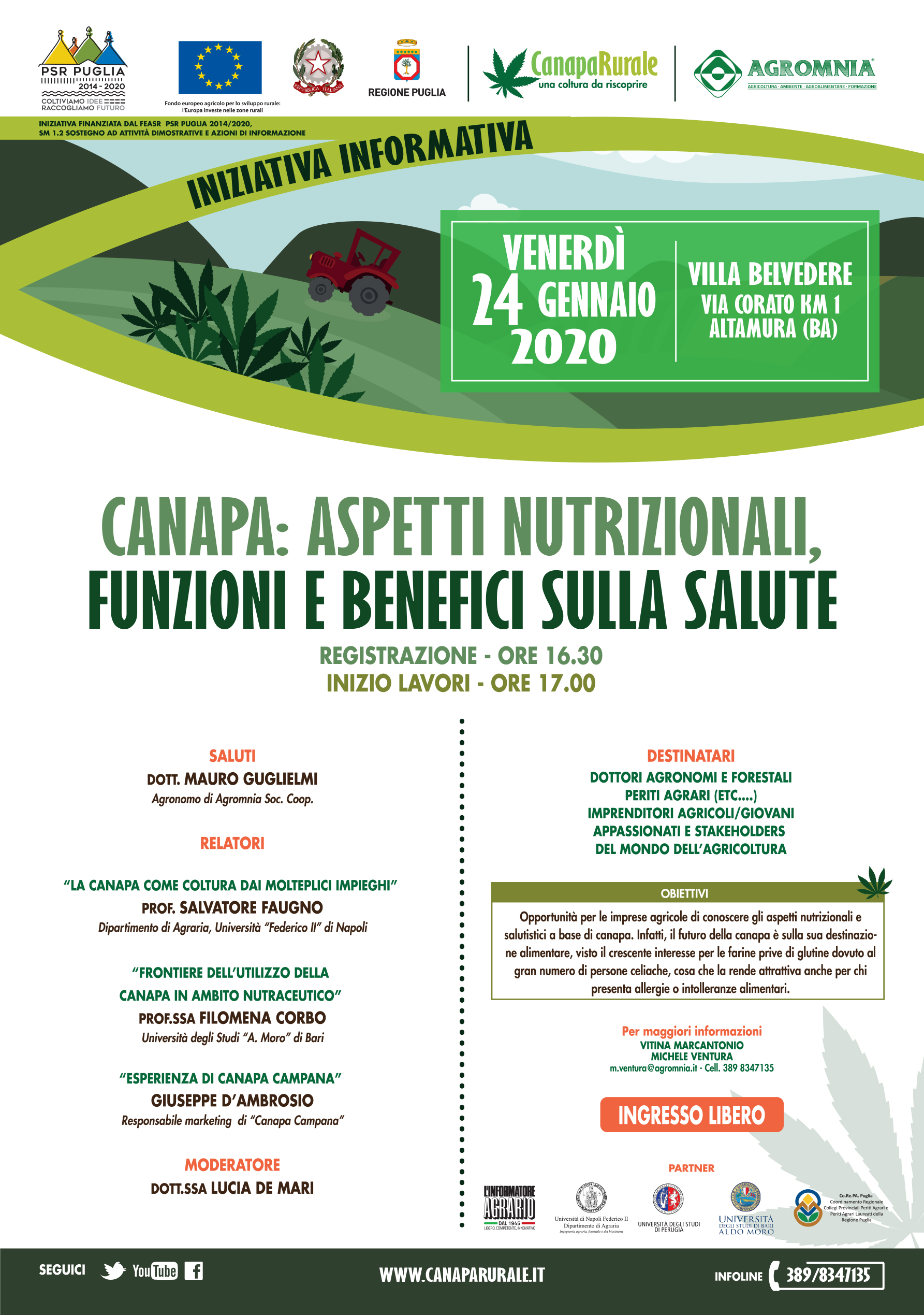 - fornire informazioni sulle tecniche agronomiche di coltivazione delle diverse filiere della canapa: food, infioriscenze e fibra.