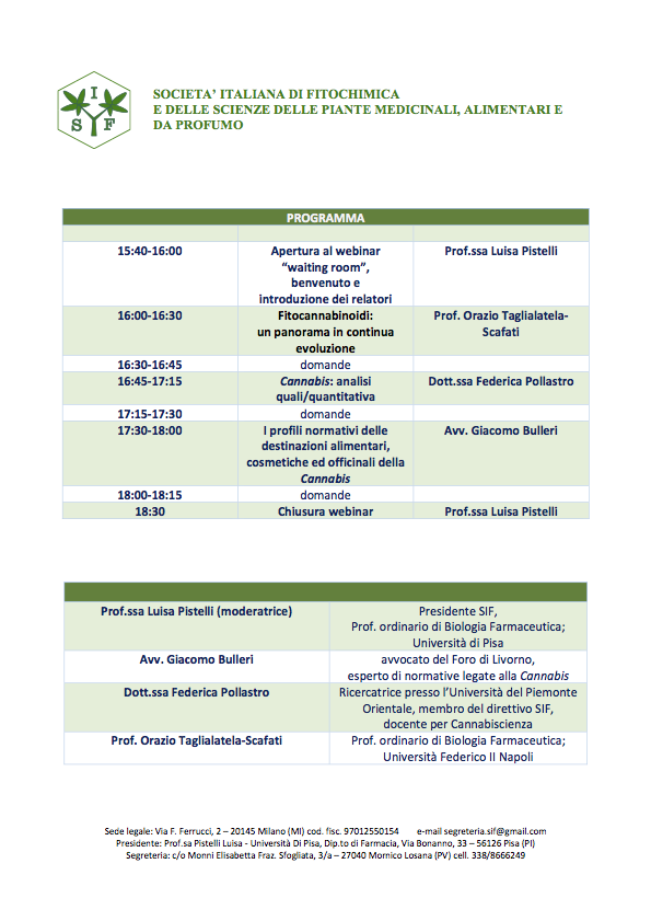 Venerdì 27 novembre dalle ore 15.40 è possibile partecipare al webinar organizzato dalla Società Italiana di Fitochimica e delle scienze delle piante medicinali, alimentari e da profumo sul tema: “Aggiornamenti chimico-normativi su cannabis sativa L.”