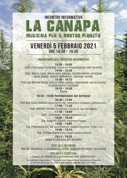 Segnaliamo questo interessante incontro informativo ONLINE sulla canapa, previsto per venerdì 5 Febbraio 2021 dalle ore 14.30 alle 19.30, accessibile tramite piattaforma ZOOM.