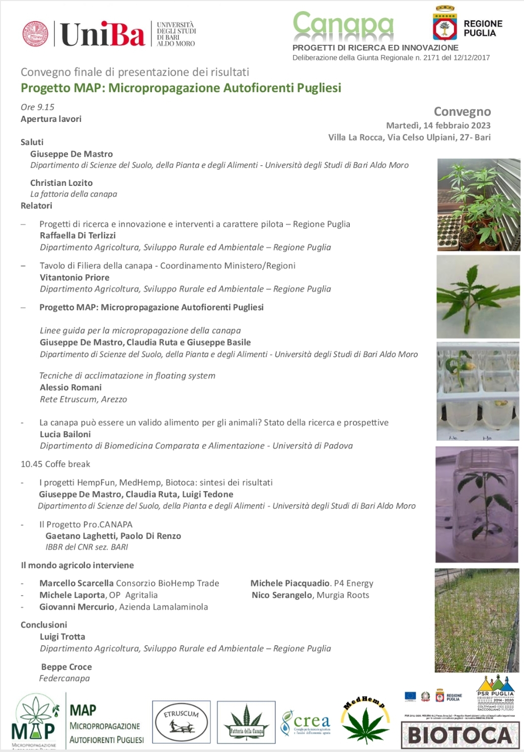 Pagina iniziale»News»Martedì 14 febbraio 2023 h 9,15-13,00 – Segui online il convegno finale Progetto MAP: Micropropagazione Autofiorenti Pugliesi Bari Centro Universitario Villa La Rocca, Via Celso Ulpiani, 27