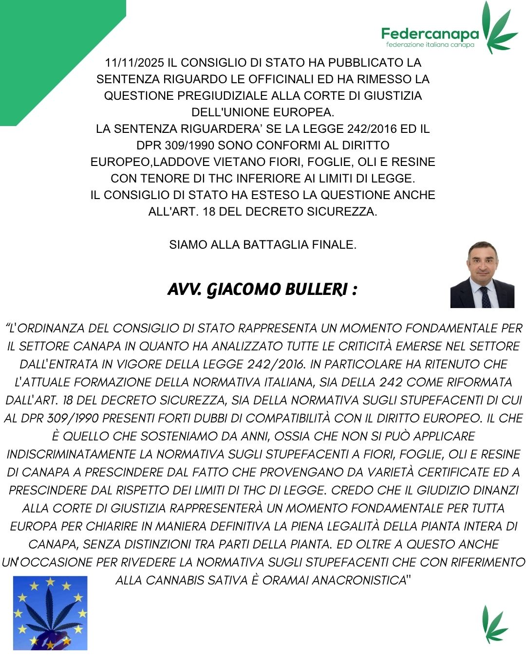 L’ordinanza del Consiglio di Stato rappresenta un momento fondamentale per il settore canapa in quanto ha analizzato tutte le criticità emerse nel settore dall’entrata in vigore della Legge 242/2016. In particolare ha ritenuto che l’attuale formazione della normativa italiana, sia della 242 come riformata dall’art. 18 del Decreto Sicurezza, sia della normativa sugli stupefacenti di cui al DPR 309/1990 presenti forti dubbi di compatibilità con il diritto europeo. Il che è quello che sosteniamo da anni, ossia che non si può applicare indiscriminatamente la normativa sugli stupefacenti a fiori, foglie, oli e resine di canapa a prescindere dal fatto che provengano da varietà certificate ed a prescindere dal rispetto dei limiti di THC di legge. Credo che il giudizio dinanzi alla Corte di Giustizia rappresenterà un momento fondamentale per tutta Europa per chiarire in maniera definitiva la piena legalità della pianta intera di canapa, senza distinzioni tra parti della pianta. Ed oltre a questo anche un’occasione per rivedere la normativa sugli stupefacenti che con riferimento alla cannabis sativa è oramai anacronistica