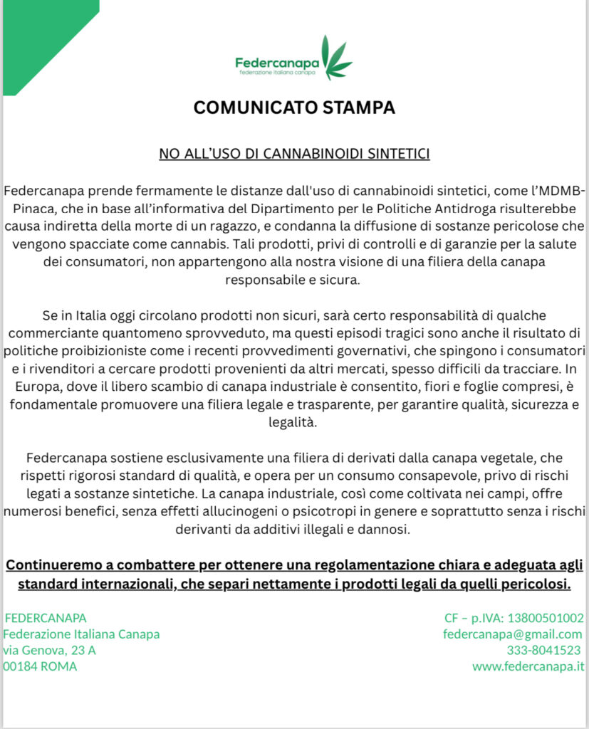 Federcanapa prende fermamente le distanze dall’uso di cannabinoidi sintetici, come I’MDMB-Pinaca, che in base all’informativa del Dipartimento per le Politiche Antidroga risulterebbe causa indiretta della morte di un ragazzo, e condanna la diffusione di sostanze pericolose che vengono spacciate come cannabis.