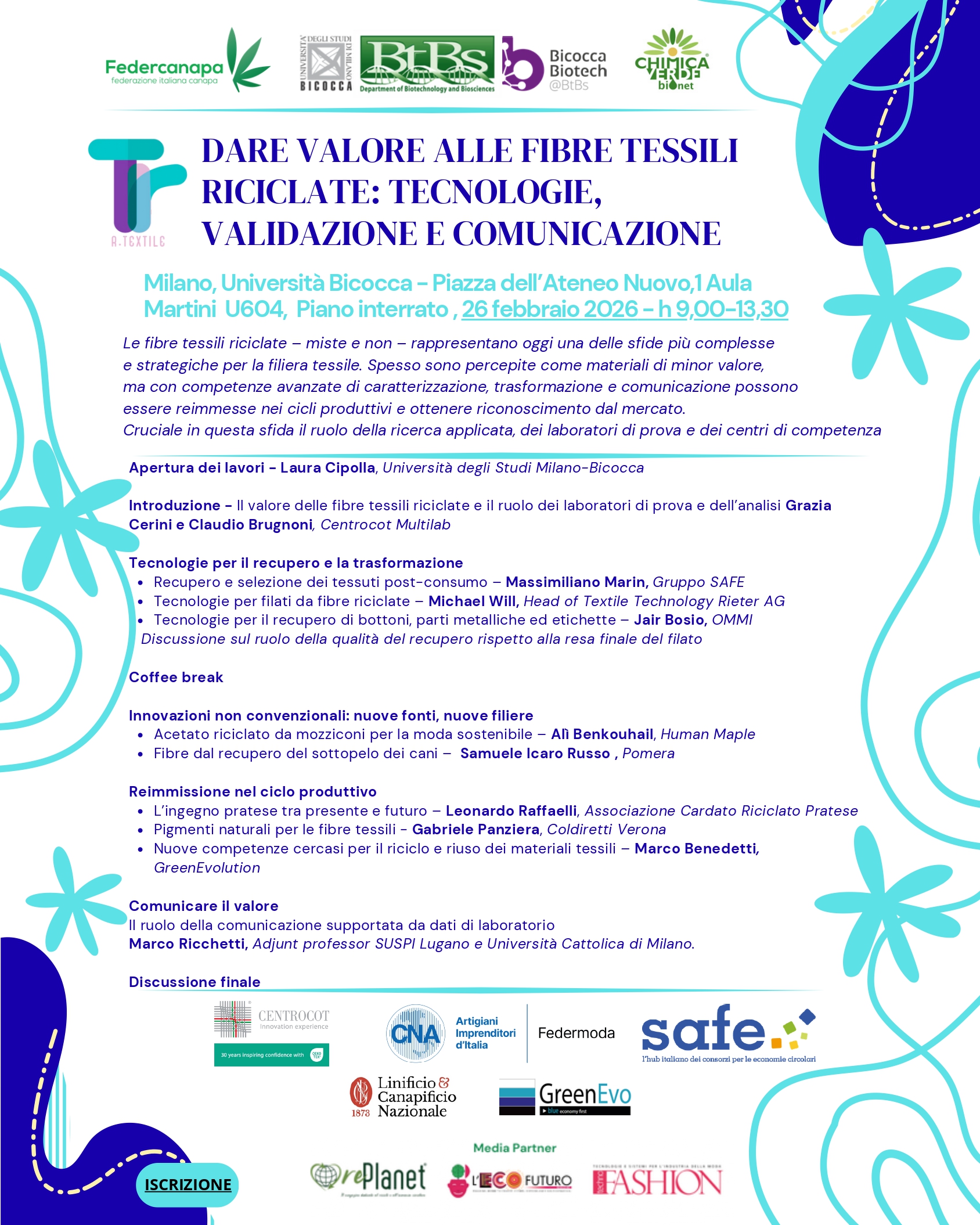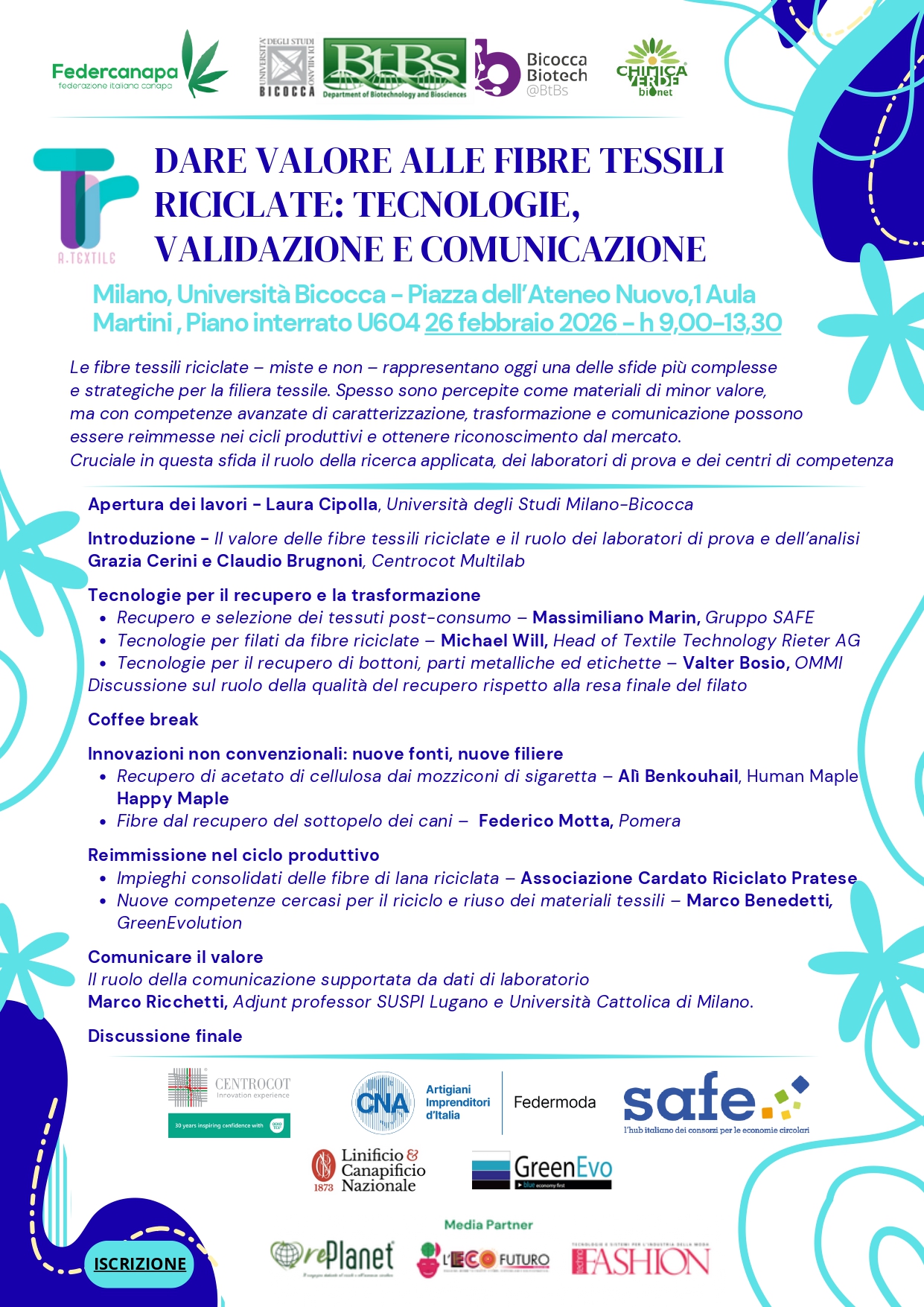 Le fibre tessili riciclate – miste e non – rappresentano oggi una delle sfide più complesse e strategiche per la filiera tessile. Spesso sono percepite come materiali di minor valore, ma con competenze avanzate di caratterizzazione, trasformazione e comunicazione possono essere reimmesse nei cicli produttivi e ottenere riconoscimento dal mercato.